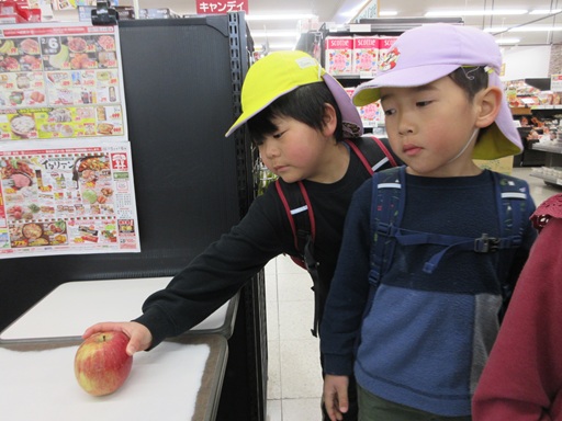 1月に焚き火してみんなで買ったマシュマロとか焼いて食べたいねと話していて、ついに今日買い物へ行けました!単調な道のりや坂道も関係なく、友だちと楽しそうに会話をしながら一号館に向かうこどもたち。到着すると事前に決めていた食べ物をグループに分かれて中へ…。よくお買い物に行っている子も多く、「カゴ持って行かないと!」と話したり「これはこの辺にあるよ!」と売り場に案内をしてくれるのです。レジへも一緒に行き、お金のやり取りも一緒にしました。帰りは「早く焚き火したいね」「今日しちゃう?」と焚き火への期待を膨らませていました。