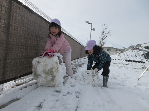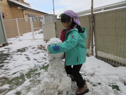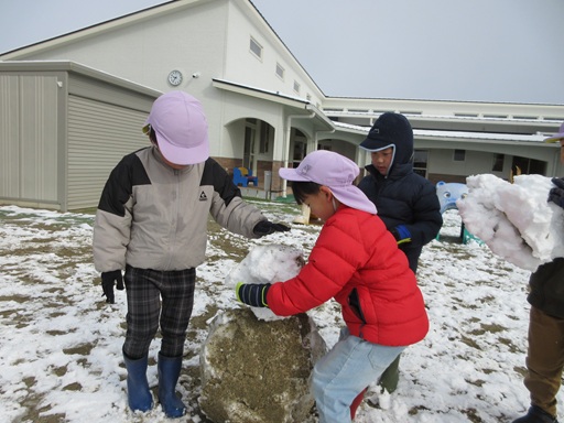 今年一番の雪になりましたね。前回は雪を投げあって遊ぶ姿が多かったですが、今回は大きな雪玉を作る子がたくさん!納得する大きさになると「大きいの作ったから見てー!」「これ一人で作ったんやで」と嬉しそうに保育士に見せていましたよ。「これのせたら雪だるまやんなあ!」と個々で作った雪玉を合わせて雪だるまを作る子たちも。できあがった雪だるまの形がよいバランスだと「いいね~」と達成感に溢れた表情をしていました!中には大きな雪玉を何個か重ね、蹴って崩すのを楽しむ子もいましたよ。