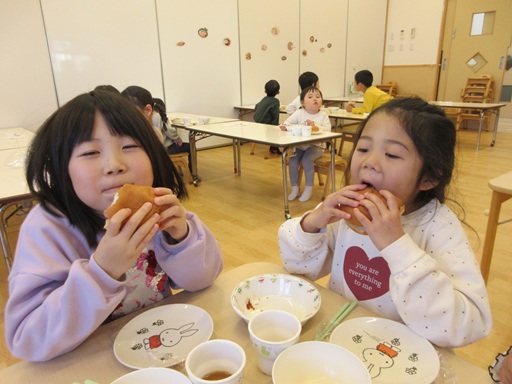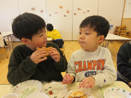 今日の給食は鮭コロッケをパンに挟んでコロッケバーガーにできるようになっていました。朝から楽しみにしていたこどもたちで、給食の時間になるとみんな遊びの手を止め、すぐにランチルームへ!さすがばらさん、挟んでバーガーにするのもお手の物で完成すると「見て!ハンバーガー!」「めっちゃ大きい!」と見せ合っていましたよ。「いただきまーす!」と大きな口を開けて幸せそうにコロッケバーガーを頬張るこどもたちの表情が可愛かったです!