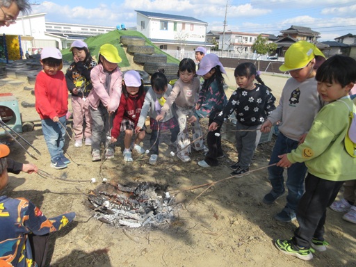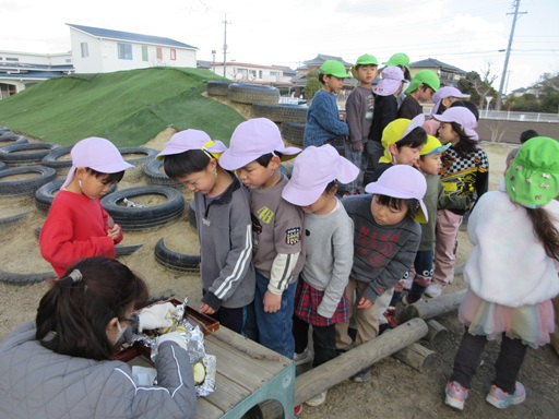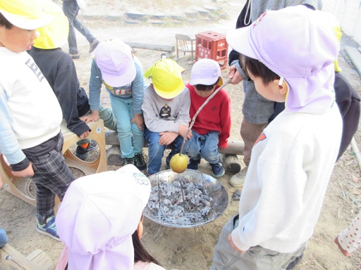 今日はついに焚火をしました!以前話していた”食べ物をどうやって焼くか?”を挑戦できドキドキしつつ、食べられることも楽しみなこどもたち。午前中は穴掘りと枝集め、午後から火を入れて温まりつつ買ってきた物を焼きました。「前話していた焼き方だよ」と確認しながら食材を火に入れていくと、ひとつひとつ夢中で様子を見るのです。「黒くなってきた!」「なんか色変わってきたよ」と変化を口にしていました。色んな焼き方、食材を食べ比べしていると「なんか香ばしいね」「トロトロ~」「うーん…」と様々な反応が…!帰りの会でも感想を共有して発見を伝えあっていました。