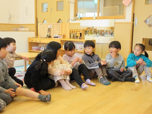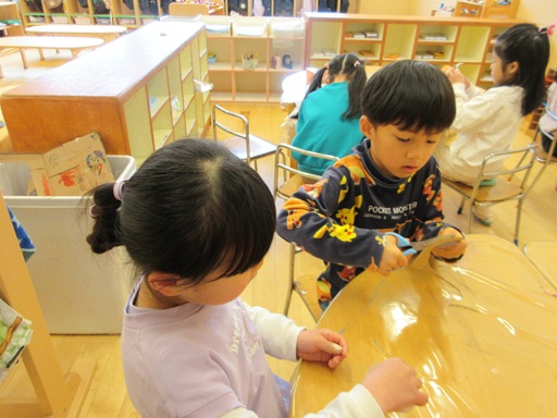 昨日の夕方にゆりさんでコマを作った子がいて、「みんなにも作ったことを教えたい!」と話があったので、朝の会で紹介しました!「先生に教えてもらって、段ボールを切ってストローを使って作ったんだよ」と説明をしたり、回して見せたり…。「すごーい!」「僕も作ってみたい!」と周りからの反応に教えた子も嬉しそうでしたよ。朝の会が終わると早速「作りたいから段ボールとストローちょうだい!」と素材を集めたり、「作り方教えて!」と紹介してくれた子に教えてもらいにいく姿が!さらに教えてもらったことを他の子に教える子もたくさんいて、関わり合いながら遊びが広がっていくのっていいなと再認識できるひとときでした。