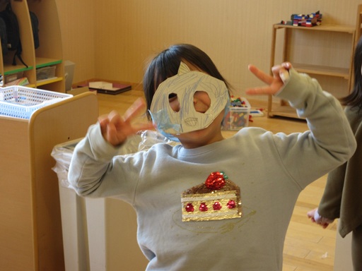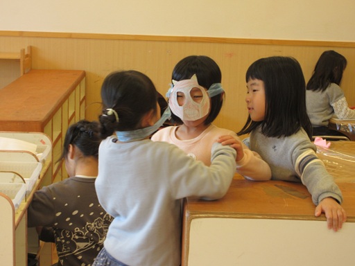 明日の節分からイメージしたようで空き箱とスズランテープを使って鬼のお面を作る子が!「見て見て!」と完成したお面をつけて友だちや保育士に見せると、「なにこれ!」「すごーい!!」「作り方教えて~」と瞬く間にクラスに広まっていくのです。「いいよ!一緒に作ろう!」とお面の作り方講座が始まり、気づけばいろんな色や顔の鬼さんがたくさんいました!明日はかわいい鬼さんたちに登場してもらおうかな…。