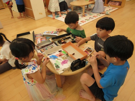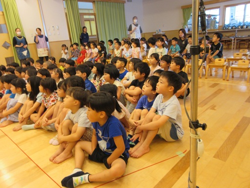 今日はむすび座の方が来て、人形劇を観ました!去年のことを思い出して「めっきらもっきらしてくれたよね」「どんなお話かな」と楽しみにする子、「紐でお人形つるして劇してくれるのかな?」と想像する子など始まるまでそれぞれワクワクの様子。始まると劇にとても夢中で、面白い時には「わははは!」と大笑い、それ以外の時にはじっと観ていましたよ。終わった後にみんなに感想を聞いてみると「おもしろかった!」「丸がべちゃって潰れる所で笑っちゃった!」「お餅がびよーんて伸びてた!」とそれぞれ印象に残った場面を話していましたよ。どんなお話だったか、また聞いてみてください!