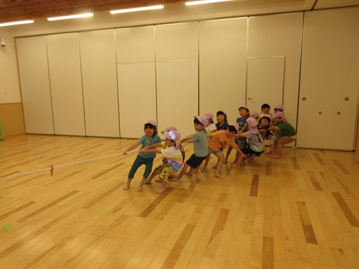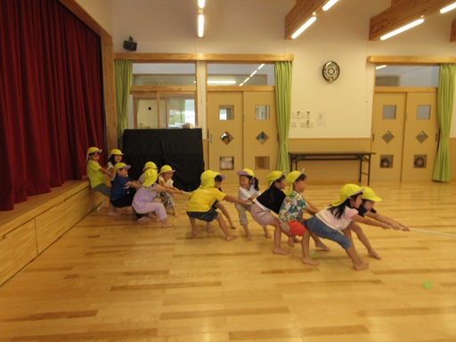今日は朝の会で新しいゲーム、綱引きをしました!ルールを説明してやってみると、腕や全身の力を使って縄を引っ張るのです。やりながら握り方を工夫して変えていってみたり、体重のかけ方を変えていましたよ。勝敗がつくと勝ったチームは大喜び、負けたチームは「悔しい!」「もう一回!」と全身で表現をしていました。2回戦目をし、次は勝敗が逆になり引き分けに。終わった後にこどもたちに感想を聞くと「おもしろかった!」「もっとやりたい!」と感じたことや「引き分けやったな!」「両方1回ずつ勝ったね」と勝敗の確認の声があがりました。みんなで協力し合って楽しめるゲームをたくさんして、運動会にも活かしていきたいです!
