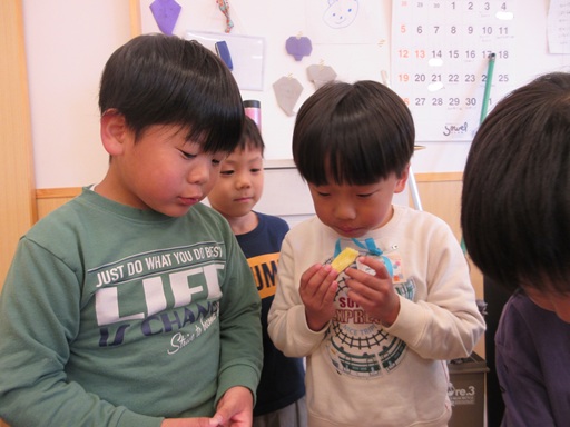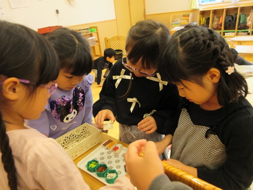 発表会でする劇が『かさじぞう』に決まりました!今日はみんなで作らなければいけないものを出し合いました。物語や紙芝居で見た時の絵をよく覚えていて、「お餅つくらな!」「おじいさんがつけてた青い手ぬぐいがいる!」と様々な物が出てきます。中には保育士も頭になかった物も紙芝居の端にあるような絵も出てきてびっくりでした!できるものから少しずつ製作していきます!