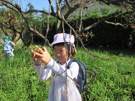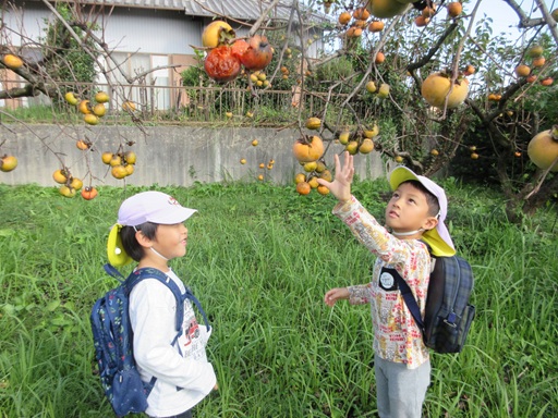 今日は柿狩りへ行きました!去年もしたことをしっかり覚えており、上手に取っていきます。すぐに採れるのが嬉しくて、「先生採れたよ!」「大きいの見つけた!」と笑顔で報告していました。あまりにも採るのが上手なので「どうやって採ったの?」と聞いてみると「くるくるってして採ったよ」「捻ったら採れるよ」と説明をしてくれ、言葉で表現するのも上手になってきたなと成長を感じました。行き帰りはすみれさんと手を繋ぎ、すみれさんが危なくないように声かけをたくさんしていましたよ。