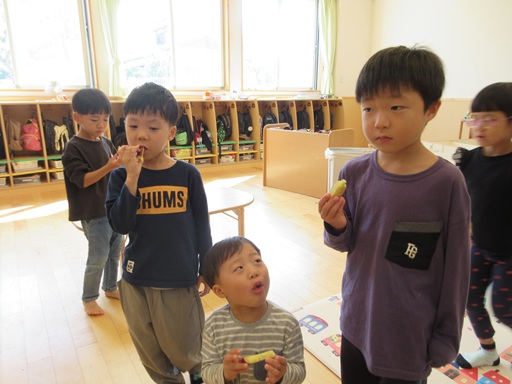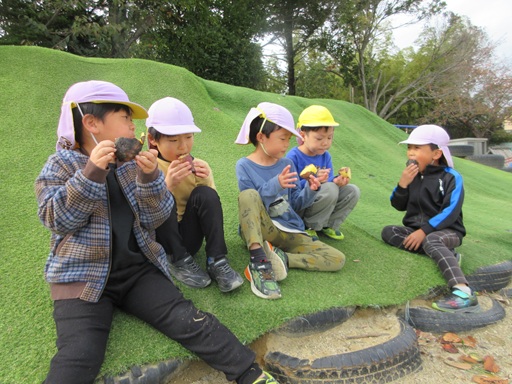 甘煮ができあがると「美味しい~!」と手が止まらないこどもたちで、食べ終わった後も『やきいもグーチーパー』の歌を歌い大盛り上がりでした!