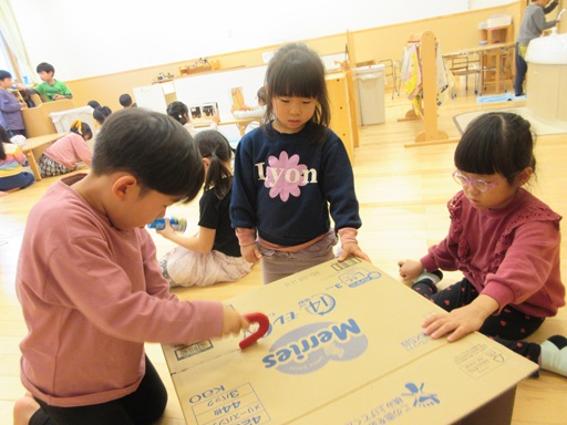 今日は劇で使うそりを作りました!保育士が作り始めると「やりたい!」と興味を持つこどもたち。イメージをみんなで共有しながら順番に段ボールを切っていき、形になってくると「もうすぐ完成だ!」と笑顔に。形ができた後は、余った段ボールをさらに切っていき、絵の具に色を塗って部品を作りました。今まで遊びの中でたくさん製作や絵の具をしてきているので、スムーズに進めていて、さすがばらさんだなと感心しました!