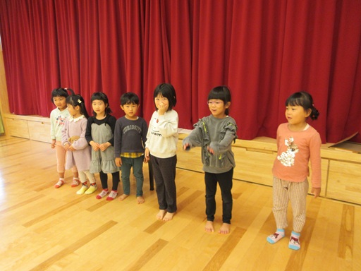 発表会に向けて練習を始めました。「かさじぞう」のお話をしっかり理解していたので、シーンごとに「こうやっておじいさん言ってたよね」「こういう気持ちだよね」とこどもたちと話しながら進めていくことができました。初めての練習で緊張もありましたが、それぞれが頑張って声を出そうとしていたり、覚えようとしていて、成長を感じました!