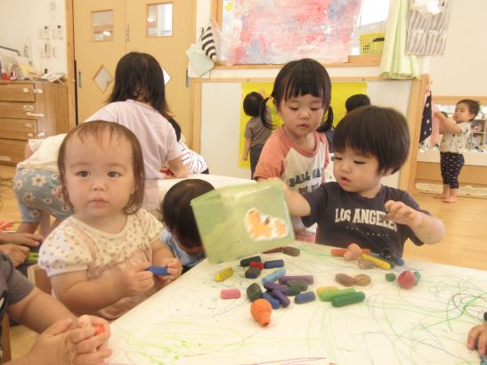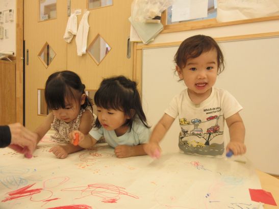 暑い日も多くお部屋で過ごすことも多かったいちごぐみさん。ブロックやままごとなどはもちろん最近はクレヨンが入った引き出しを叩いて“やりたいよ~”と伝えたり「ふうせん!」とリクエストする姿も見られます!机に模造紙を広げると「うわぁ~!」と声を上げて集まってきます。それぞれ好きな色のクレヨンを手に取り、思い思いに色をつけていくのです。「あか!」「でった!(できた!)」と楽しそうな声が飛び交う様子に私たちも心温まります♪