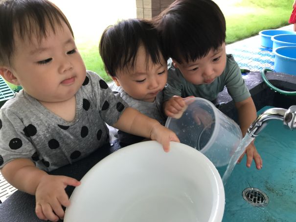 日に日に暑さが増し、水遊びが気持ちいい季節になってきました。こどもたちも水遊びの気持ちよさを知りガーデンの扉がが開くとニコニコで水遊びに向かう姿があります!特に水道が好きな子が多く、ガーデンに出ると一直線に水道まで行き水を出して手にかかる水の冷たさや手の平に当たる水の圧を楽しんでいます♪