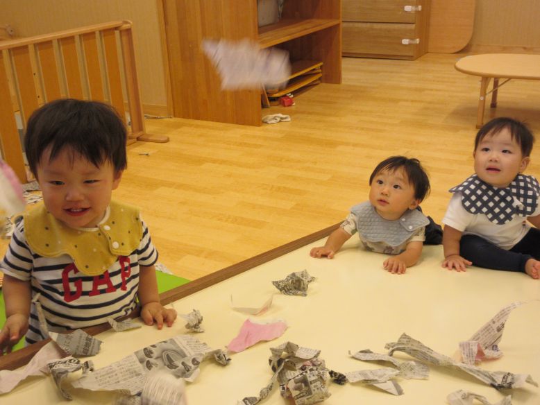 またシフォンスカーフを使ってふれあい遊びを楽しむ姿もあります。保育士が「上から下から大風こーいこいこいこい」といった歌を歌って頭に被せいないいないばあっを楽しむと保育士に笑顔を見せてくれます。