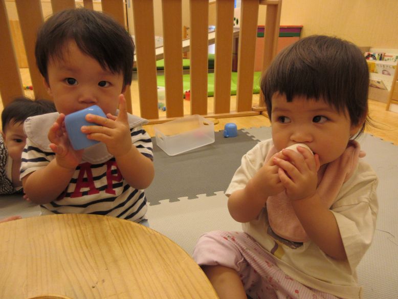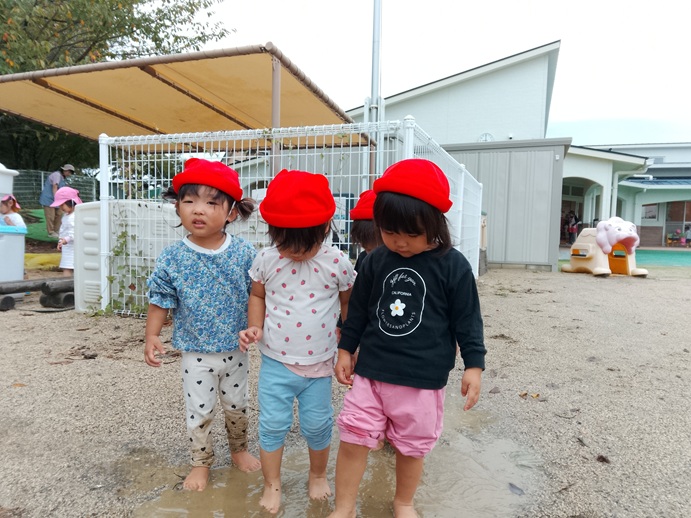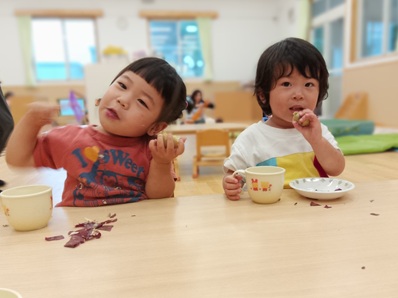 雨が上がった日には、水たまりを見つけて遊ぶ姿もあり、靴を脱いで足や手で泥の感触を味わい、”気持ちいいな~””嫌だな~”など、それぞれの表情や反応がありましたが、不思議な感触が気になり足元を見ていたり、泥を上から落としたりと友だちと一緒に楽しそうに遊んでいました。その後はお着替えをし、おやつをたべるいちごさん♪おやつが大好きで自分で椅子に座り「ばななー!」と伝えてくれる姿もあり、いつも美味しそうに食べています。
