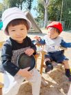 戸外遊びでは砂場が大好きで、近くにあるお皿に砂をたくさん入れて手のひらでトントンと押し固めてみたり、砂を入れてはジャーっとひっくり返し空っぽになることを楽しんだりしています。