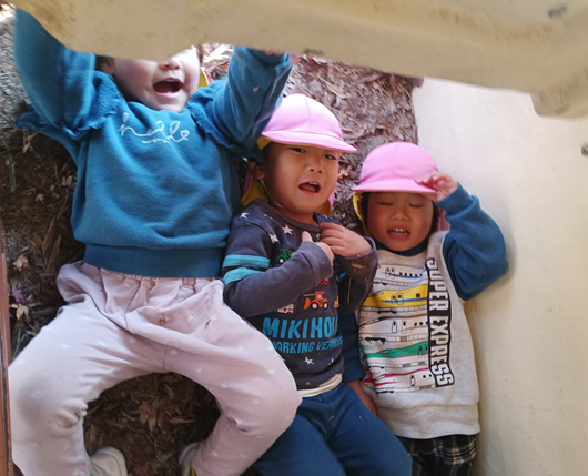 今日も元気いっぱいに園庭に出掛けていき、築山で登ったり下りたりするのを楽しむももぐみさん。強い風が吹き帽子が取れてしまうと「うわあ~!」「とれちゃった!」と大盛り上がりなのです!!何度被っても取れてしまうので、「トンネルに行けばいいんじゃない?」と提案してくれる子が!一緒に遊んでいた子たちや近くにいた子も「ぼくも・わたしも~」とトンネルの中に隠れていましたよ♪すみれぐみの子が来ると、「いいよ~」と言って一緒に隠れる姿が可愛らしかったです!