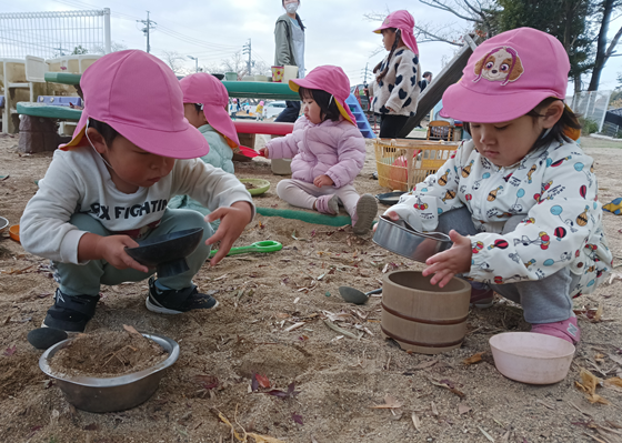 今日は朝から雪が降っていましたね!窓からのぞいてワクワクした表情で「ゆきふってるよ」「おそといきたい!」というもも組さん。上着をしっかりときて園庭で元気いっぱい走り回りますよ。その後、砂場にあるスコップやお皿を持って砂山に行き、さら粉を作ったり、ケーキやたこ焼きを作ったりします。遊んでいると砂山の大きな穴に入り、「たすけてー」という子の姿が!すると周りの子が「だいじょうぶ?」「こっちだよ」と手を伸ばして助けてくれるのです。そのやり取りが楽しかったようで、入れ替わって穴に入り、助けてもらうのを繰り返していましたよ♪こどもたちの優しいやりとりに心が温かくなりました。
