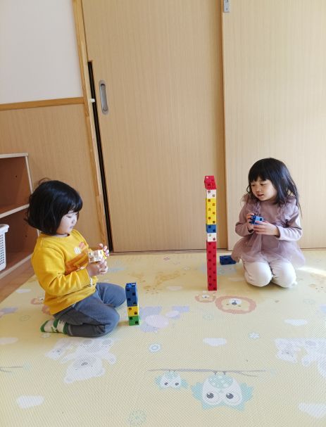 今日は椅子を縦に並べて電車ごっこをするもも組さん。「〇○がうんてんするー」「こっちにしよ!」と好きなところに座ると、「しゅっぱつするよー」「ここあいてるよ」とお部屋にいる友だちに声を掛けて一緒に乗ろうと誘うのです。みんなが座り、椅子がうまるといよいよ出発!「がたんごとん」と体をゆらゆら揺らして電車の揺れを再現するのが可愛いですよ。電車が目的地に到着すると「おおきいイオンにいく」「かいものいこう」「こうえんついたー」と思い思いの場所に出掛けていくこどもたちでした♪