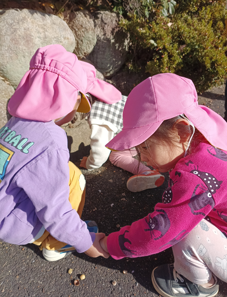 朝から、「お散歩行きたい!!」とこどもたちからの発信があり、おやつを食べた後園周辺のお散歩に行ってきました♪前に行ったところを覚えていて、「どんぐりあるかな?」「橋のところいきたい!」と話しながら探検を楽しみましたよ!どんぐりがたくさん落ちているのを見つけ、どんぐりを踏んで‟パリパリ”と鳴る音を楽しんだり、友だちと一緒に集めながら「いっぱいあるよ!」「われてる!」など様々な発見をするももぐみさん!橋の所では、色んな車を見たり「やっほ~!」と手を振ったりしていましたよ♪
