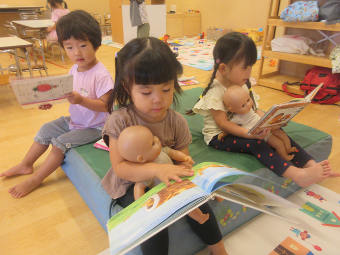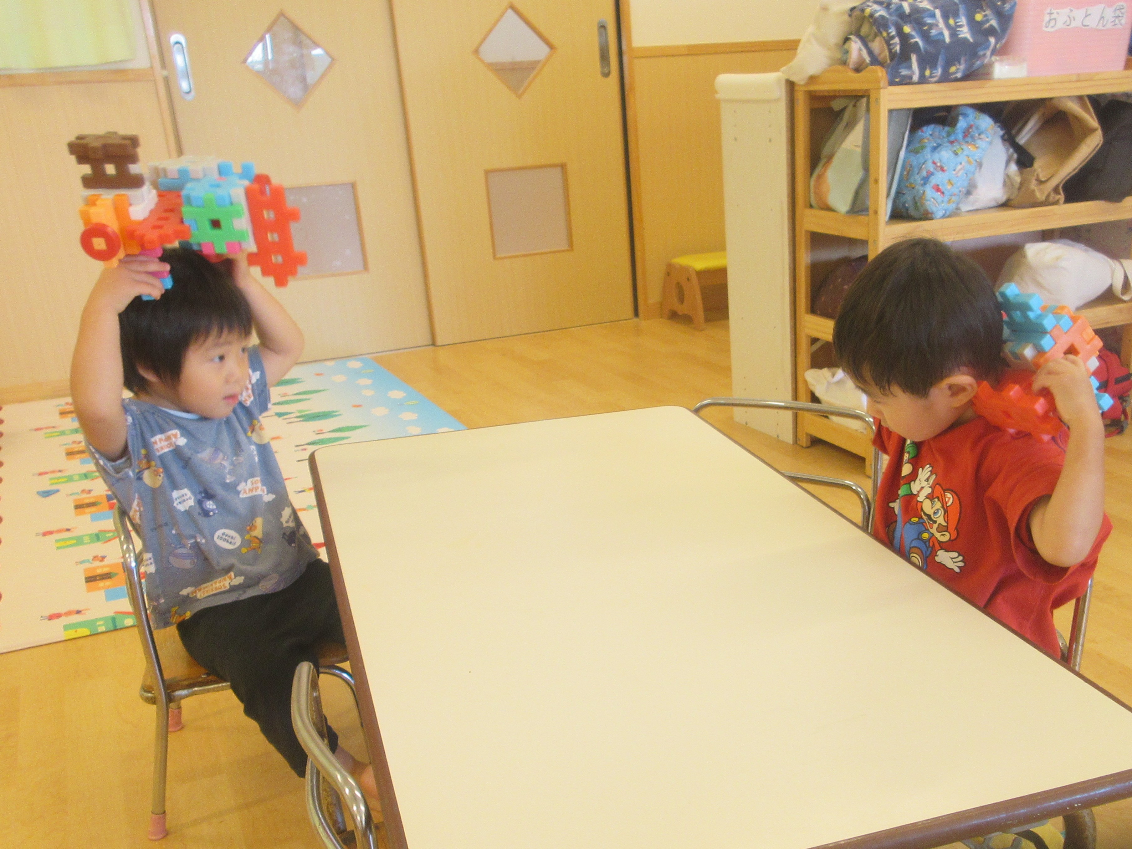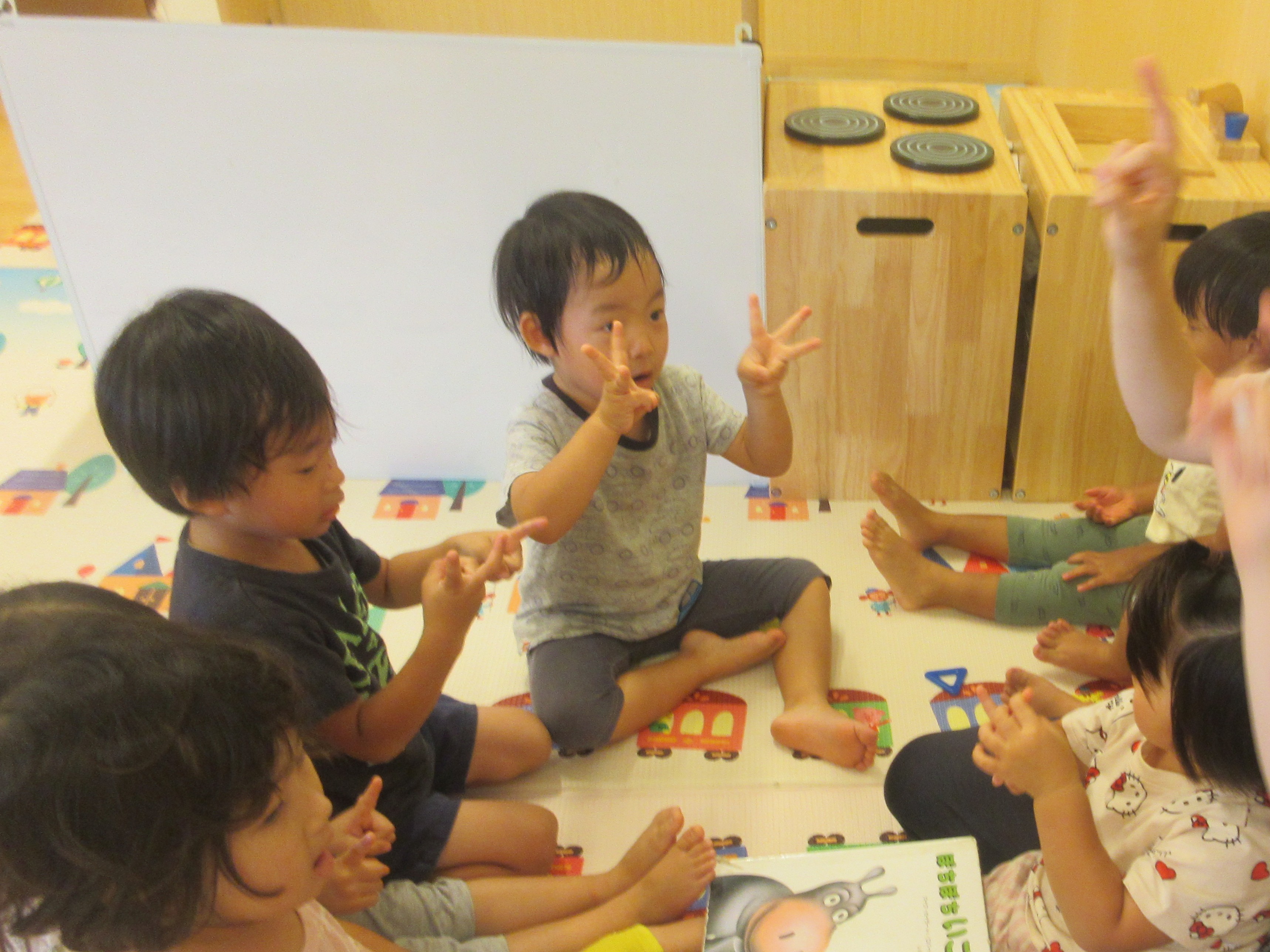 今日もいい天気だったため、お外やお部屋で好きな遊びを楽しむもも組さん。一人ひとり好きな遊びが出来ていて、「お外でどんぐりさがそう」「お部屋戻ってパズルする」と自分のしたい遊びを保育士に知らせてくれますよ。お部屋では変わらずブロック遊びが人気で「できたよー」「ここではしれるんだよ」と作ったものを見せてくれます。言葉や仕草で伝えてくれて、こどもたちのイメージを共有してくれるところに成長を感じて嬉しく思います!また最近は”キャベツの中から”の手遊びをすると、指を一本立てて「こうかな?」「できたよー」と保育士の真似をして楽しみます。手先の使い方も少しずつ器用になってきて、小指を立てて「あかちゃんあおむし!」と見せてくれるのが可愛いです♪