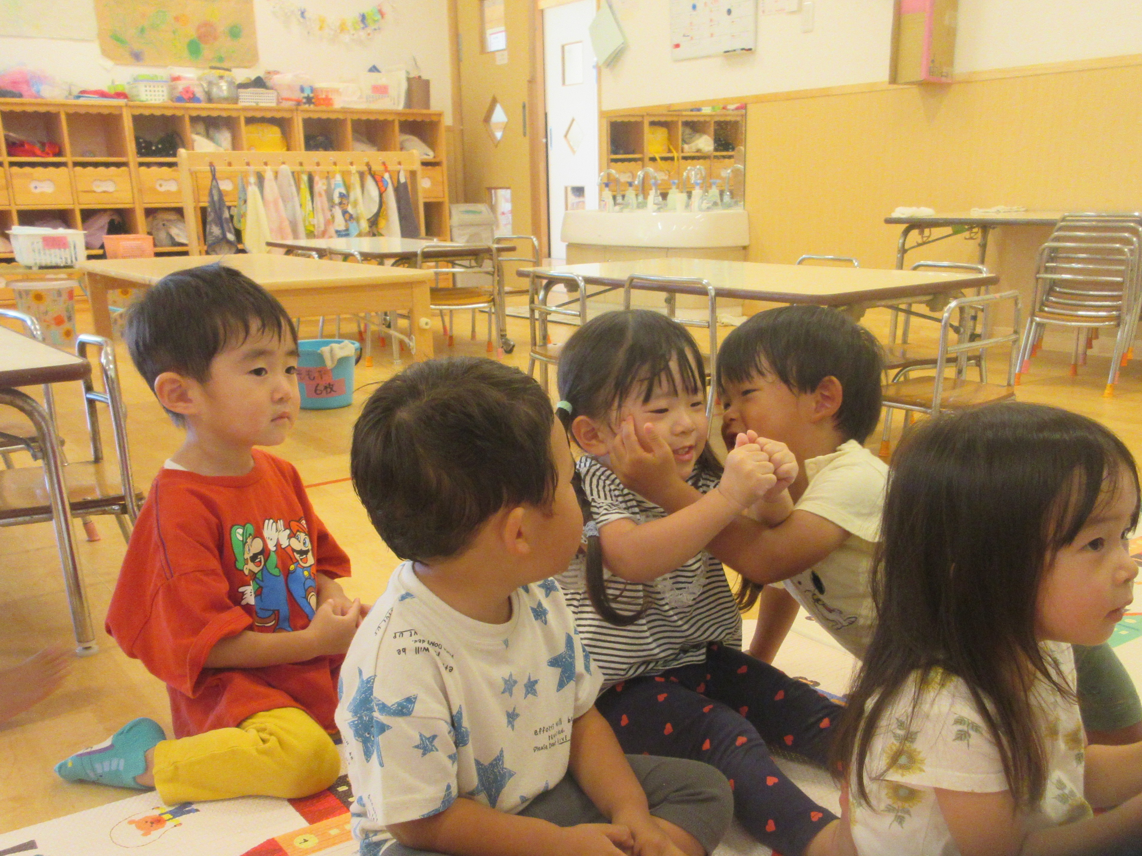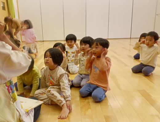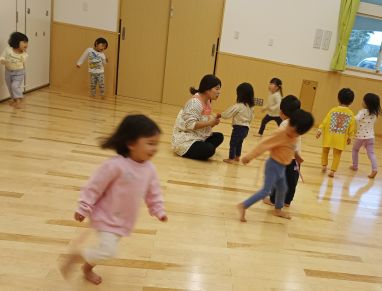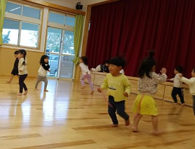 今日はこどもたちから「ホールであそびたい!!」と発信があり、ホールでしっぽとりをしました。スズランテープで作ったしっぽを用意すると、ズボンに少し入れてしっぽをつけて、「みてみて、しっぽ!」とくるりと回って見せてくれます。みんながしっぽをつけるとよーいどん!で走り出します。保育士がつけているしっぽが人気で、保育士が逃げるあとをこどもたちが「まてー!」「しっぽとる!!」と追いかけるのです。また保育士に追いかけて欲しい子は「こっちだよー」としっぽが見えるようにおしりを振ってアピールするのが面白いです。途中でお茶を飲んだり絵本を読んだり休憩もはさみながら、ダンスやサーキット遊びもして、ホールを全力で楽しみました。引き続き雨の日でも身体を動かして遊んでいきたいと思います♪