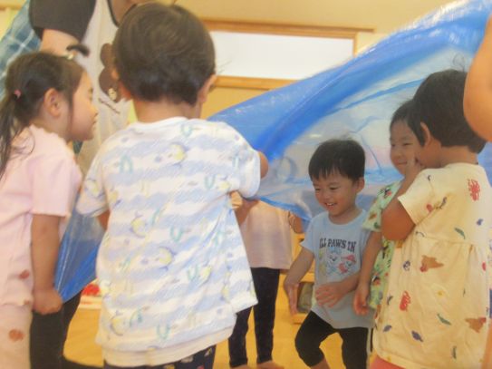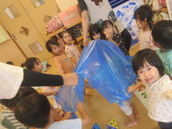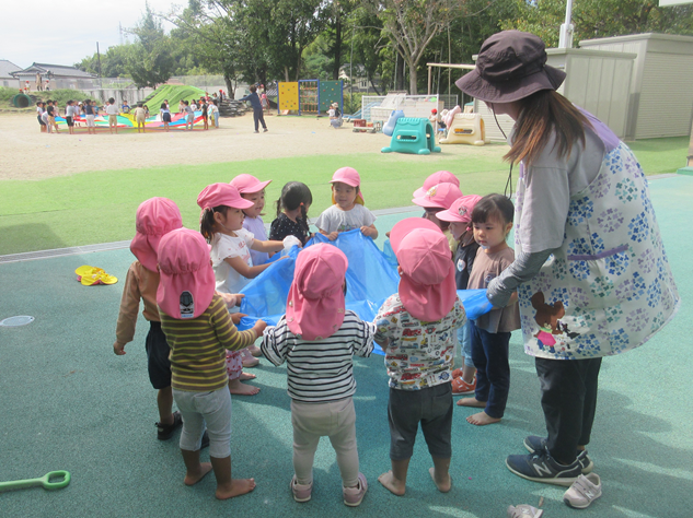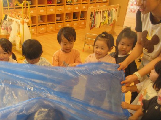 運動会の練習を見て、ばらぐみさんのバルーンに興味を持ったもも組さん。バルーンに見立てたビニールを用意すると「するー!」「やりたい!」と目をキラキラさせて集まります。みんなで円になってビニールを持ち、ばらさんの様に「あーるーくっ!」と言いながら歩いたり、「なみなみなみなみ」と言いながら上下に揺らして楽しむのです。すると「ひーっぱる、もあったよ」「あるくときはてをあげるんだよ」とこどもたちから発信があり、よりばらさんっぽくバルーンを真似することが出来ましたよ。練習をしっかりと見て覚えていたこどもたちに驚かされました。憧れのばらぐみさんと同じことが出来て、とても嬉しそうなももぐみさんでしたよ♪