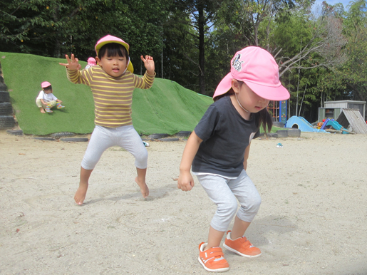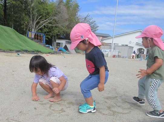 大きい組さんがしている運動会の取り組みに興味津々のももぐみさん。ゆりぐみさんがフラフープを使ってジャンプをしていたので、保育者が園庭に丸を書くとぴょんぴょんぴょんっと飛んでみるのです。気づけば、こどもたちが丸の続きに付け足して丸を書き、その上をジャンプする子もいて見ていて微笑まっしかったです。