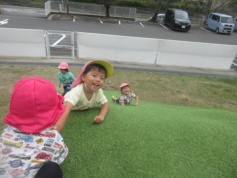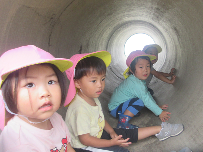 今日は、お外で遊んでいると少し雨が降ってきました。築山で遊んでいた子が「あめがふってきたよ!」と気づき、「トンネルにいこう!」と隠れるのです。周りにいた子も、トンネルの中に避難していましたよ。トンネルの中で話をすると、声が響くのに大喜びで、「やっほ~!」「〇○ちゃ~ん」と呼んだりして楽しんでいました♪ポツポツと雨が降ってきたので、お部屋まで“よーい、どん!”をしてお給食を食べに行くももぐみさんでしたよ!