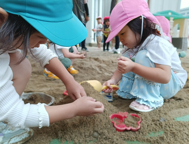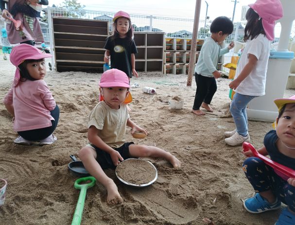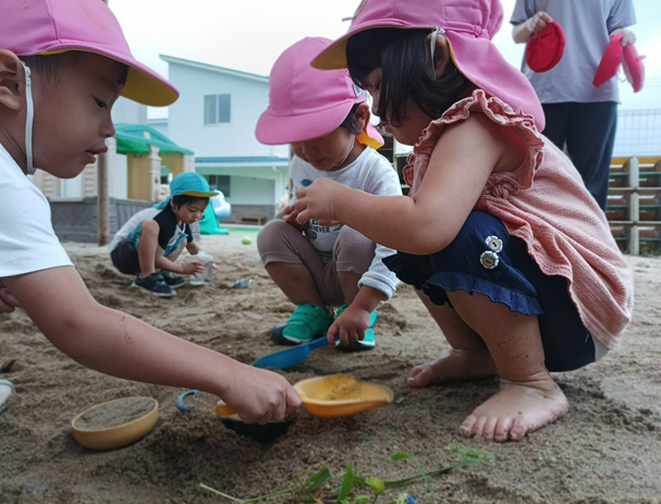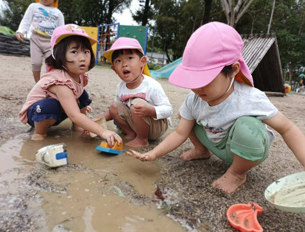今日は、園庭に落ちているどんぐりや草花を集めて、砂場でケーキ作りをするこどもたち。ピンクのお花やぶどうのような実を見つけると、お友だちにも「これは○○ちゃんの」「これは○○くんにあげる」と配ってあげる子も…!沢山集めてくると、砂場でケーキ作りが始まりました♪カップでケーキを作ると、上に飾り付けたり、どんぐりを中に入れたり思い思いに楽しんでいましたよ!園庭には雨上がりの水たまりも出来ていて、車のおもちゃを入れて洗ったり、手でちゃぷちゃぷしたり泥んこ遊びを楽しみました。