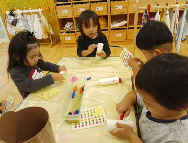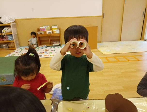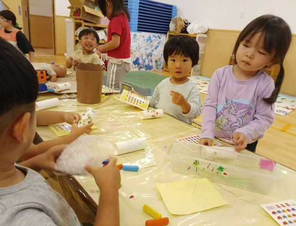 今日はトイレットペーパーの芯にクレヨンで色を塗ったり、シールを貼ったりするもも組さん。シールを重ねて張ったり、シールの上からクレヨンで色を塗ったり、色々な色を少しずつ塗ったりして、個性豊かな作品が出来上がりましたよ!シールを貼り終わると、「なまえかいて~」という子の姿があり、それを聞いた周りの子も「ここにかいて」「〇○くんってかいて」と知らせてくれるのですよ。保育士が名前を書くと嬉しそうに自分が作った作品を見つめる姿が可愛いです。作った後は芯の中をのぞいてみたり、口に当ててメガホンのように「わ~!」「〇○ちゃーん」と叫んでみたり、思い思いに楽しむもも組さんでした♪