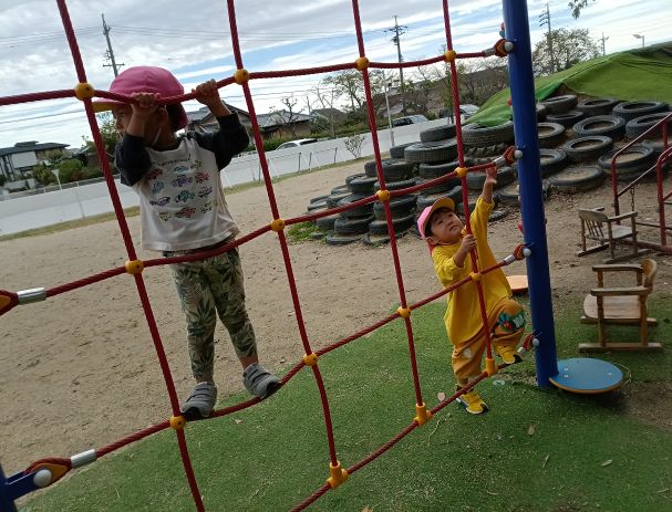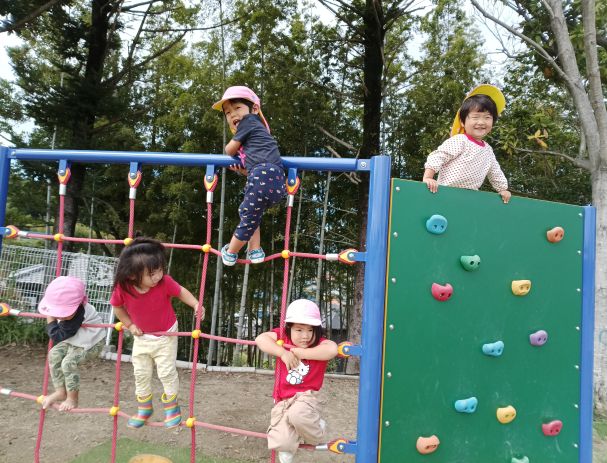 今日はロープネットやロッククライミングで遊ぶもも組さん。ロープネットでは手でしっかりとネットを握ると一歩一歩足に力を入れて上まで登り、上から「たかいよー」「みてみて~!」と嬉しそうに教えてくれますよ。友だちと隣同士で登り、ネットに座ってみたり少しネットを揺らしてみたりして楽しむ姿もありました!ロッククライミングはスタートの位置が少し上にあるのですが、こどもたちが自分で考えて踏み台を運んできてその上に乗り登ろうとするのですよ。自分で登れない時にも諦めず、登っている友だちの姿をじっと観察して真似してみたり、保育士に少し支えてもらったりしながら何度も挑戦する子の姿もあります!出来なかったことができるようになると、「できたよ!!」と誇らしげな笑顔を見せてくれるこどもの姿に、私たちも嬉しくなりますよ♪
