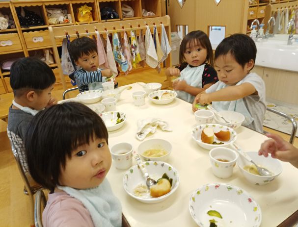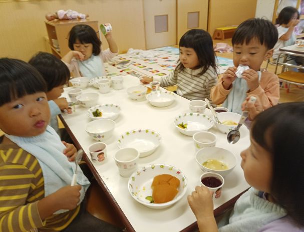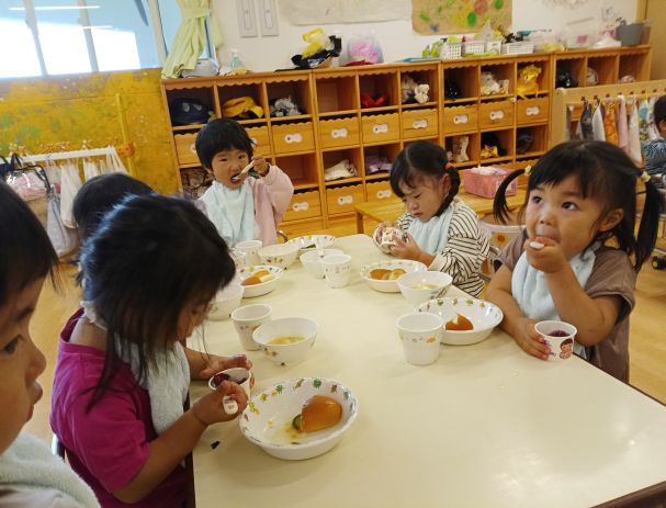 今日の給食にぶどうゼリーが出ると、大喜びのもも組さん。ゼリーを配ると「ゼリーだ!!」と目をキラキラさせて受け取りますよ!ブロック遊びや砂遊びなど手先を使う遊びを通して、手先の動きもどんどん上達しているこどもたち。ゼリーの蓋を自分で開けてみようと挑戦し、「あけれたよ!」と開けられる子もいて成長を感じました。最初が少し硬くて開けられない子も保育士に「あーけーてー」と知らせてくれて、保育士が少し開けると残りを頑張って開け、「あいたよ!」と笑顔で見せてくれるのです!また「あかない…」と困っている友だちの姿を見て、「あけてあげる!」と助けてくれるこどもの姿もあって心が温かくなりました。ゼリーの蓋を開けられると、早速食べて「おいしいねー」「ぷるぷるしてる~」「ぶどうあじだ!」と楽しそうに食べるこどもたちでした♪これからもいろいろな遊びを通して、様々な力を身に着けていきたいと思います。