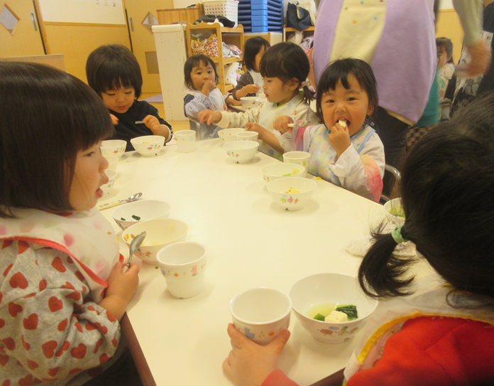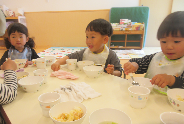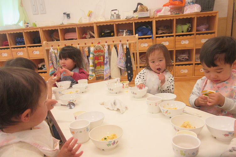 ももぐみさんでの生活が始まりましたね。進級して新しいお部屋や玩具にワクワクドキドキのこどもたち。新しいお友だちも増えて、「おなまえは?」と聞いてみる子の姿も見られましたよ。聞かれた子も、少し照れくさそうに名前を答えていました!たくさん遊んだ後は、お給食の時間!!保育者や友だちと一緒に「おいしいね!」などと話しながら食べていましたよ。これからも、食事の時間が楽しいと思えるような声掛けや、関わりをしていきたいと思います!改めて、一年間よろしくお願いします。