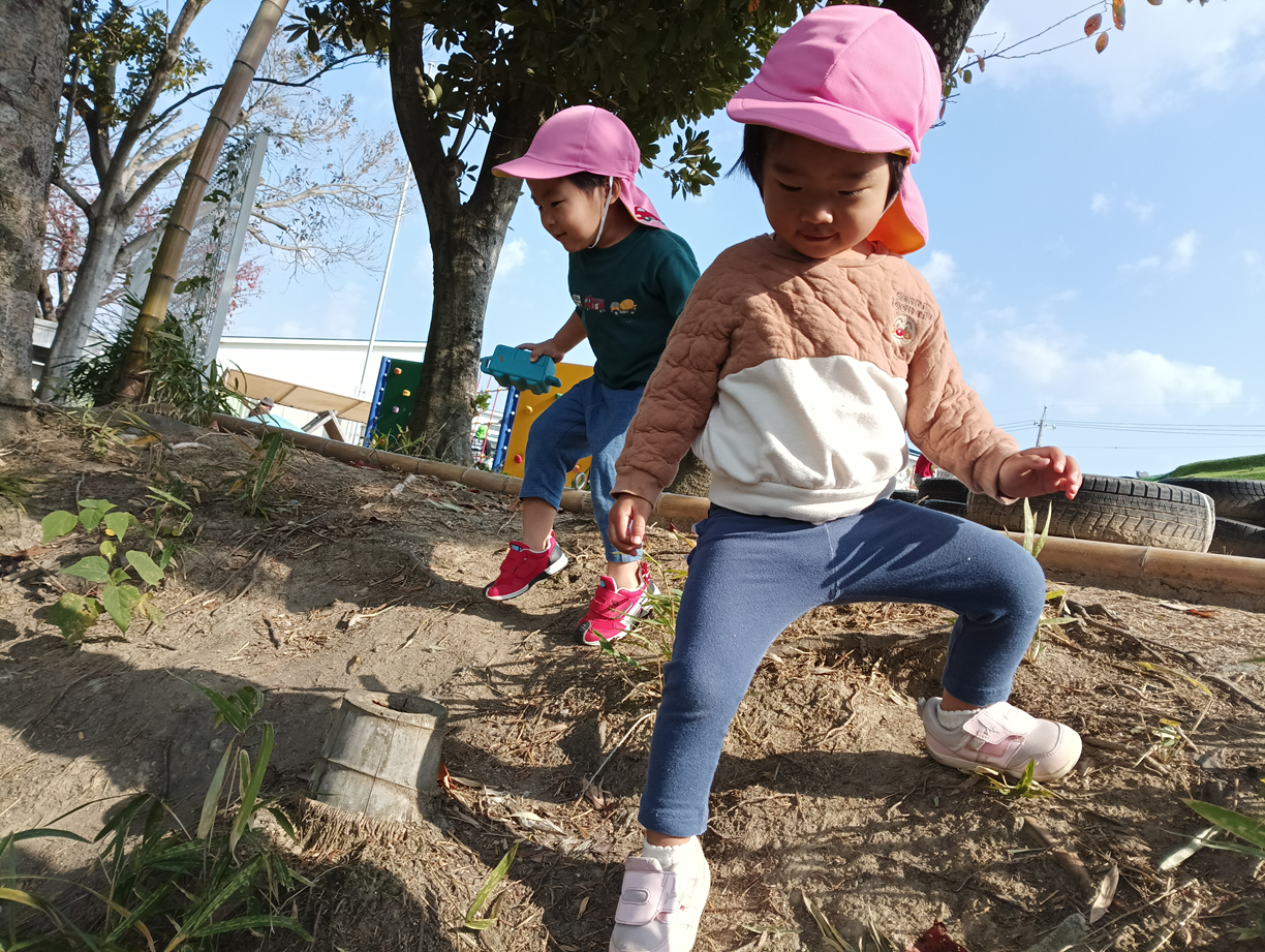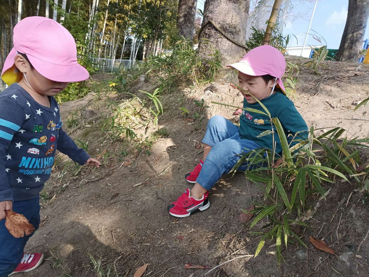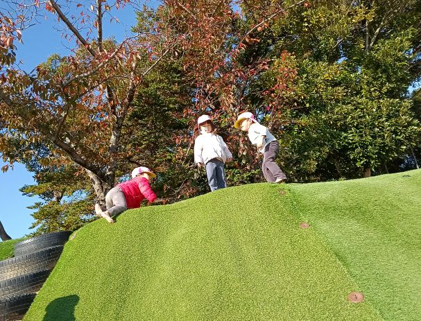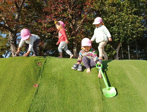 今日は築山で遊ぶもも組さん。芝の斜面から登ろうとして、「ああー」と何度も滑り落ちるのも楽しみながら上を目指します。一番上まで登れると、「こっちだよ」「頑張れー!」と手を差し伸べたり、友だちを応援したりする姿もありますよ。みんな上まで登ると「ここからすべろっか」と言って横一列に並び、「さん、にー、いち、しゅー!!」とタイミングを合わせて滑るのです。友だちと一緒に滑ることが楽しいようで、「もっかいしよー」と何度も繰り返し滑っていましたよ♪