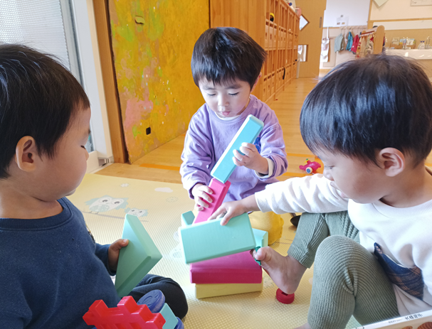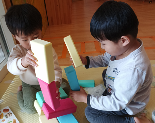 最近は、お部屋に置いてある大きな積み木が人気で、高く積み上げたり、自分のお家を作ったりして楽しむのです!友だちがしているのを見て一緒に積み上げてみると「たかいよ!!」と嬉しそうに教えてくれます♪グラグラと揺れて倒れてしまっても「わあ~!!」と楽しそうで「もう一回作る!」と作っては崩れるのを繰り返していましたよ!