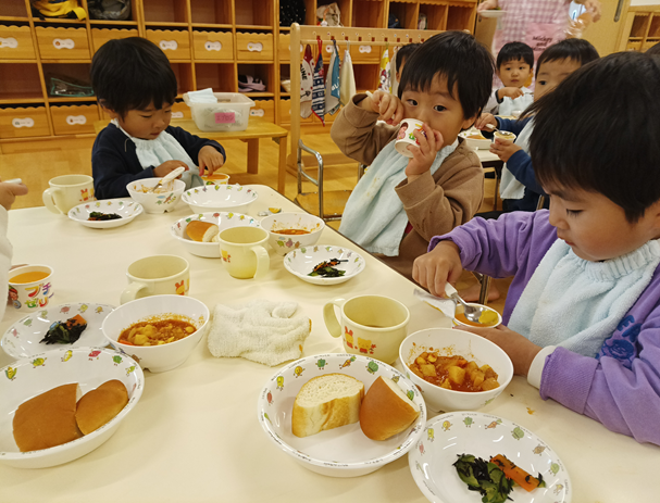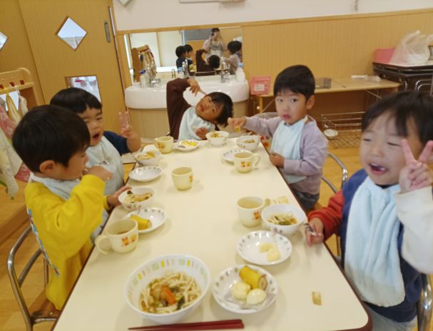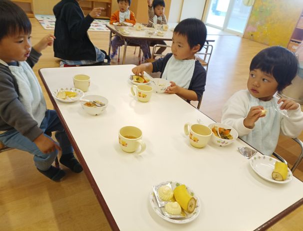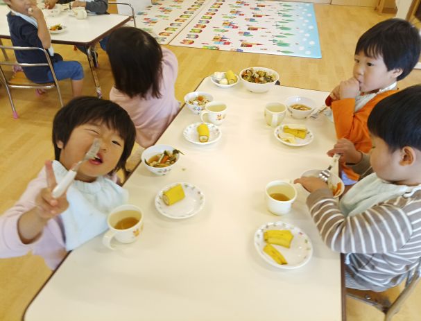 お給食は七五三のお祝いメニューで、人気だったチキンカツはみんな嬉しそうにほおばっていましたよ!赤飯は「ちょっと味見してみる」と挑戦する子もおり、特別な日のご飯を味わいながら楽しい時間を過ごしましたよ♪