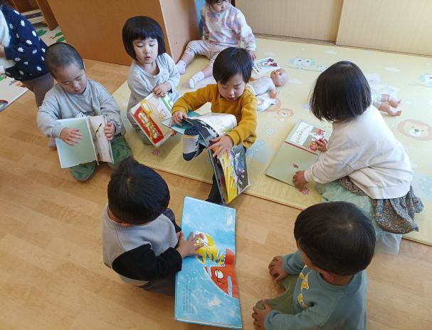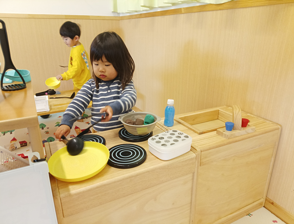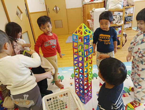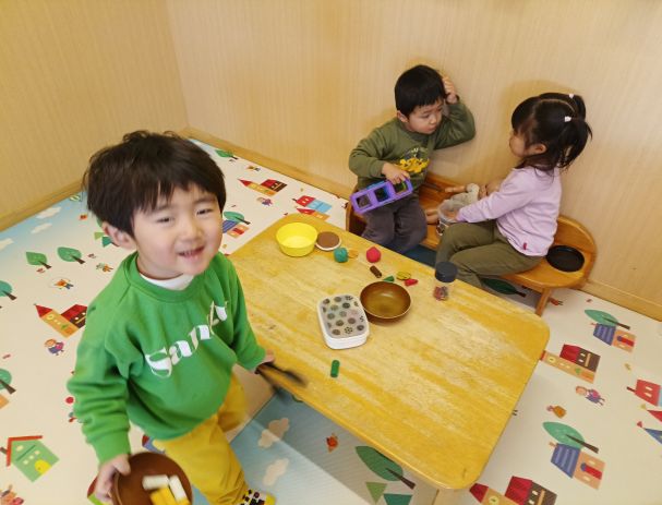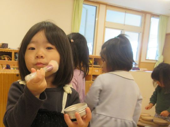 今日はすみれ組のお部屋に遊びに行きました!もも組にはないおもちゃもたくさんあって「これなあに?」「みてみてー」と興味津々のこどもたち。「こうするんじゃないかなー」と友だちと話し合いながら遊びます。メイク道具を見つけると、「これはおけしょうするやつ!」「かわいくなるよ!」といって、ほっぺや唇にブラシで塗るのです。「これぬるとあかくなるよー」「めのうえにもぬるの!」と使い方を知っている子たちが一生懸命伝えてくれて、それを聞いた子が真似をするのが可愛らしいです。これからも一緒にいろいろな遊びを楽しんでいきたいと思います♪