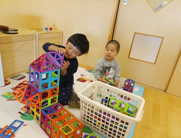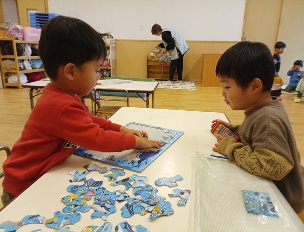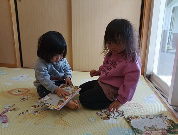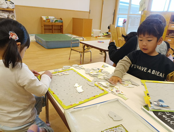 朝から「パズルしたい!」とこどもたちから知らせてくれる姿がありました。新しいパズルも増やしたので、「これ、あたらしいの?」「これにする!」と嬉しそうに選ぶのです。やりはじめても、「これはどこ??」「わからない…」と苦戦する姿もありましたが、「ここじゃない?」と教えてくれる友だちも!真剣な表情で、ここかな?と考えながらパズルをはめていき、完成すると「できた!!」と満面の笑みで見せてくれるこどもたちで、こちらも嬉しい気持ちになりました♡