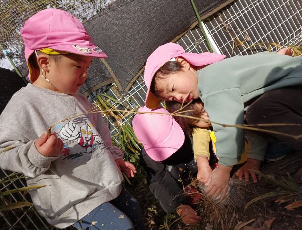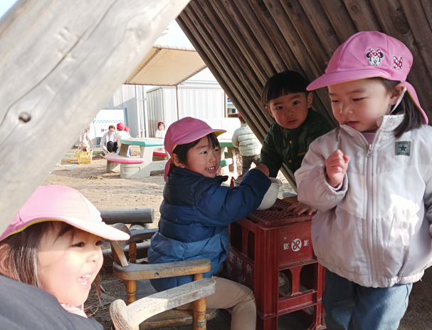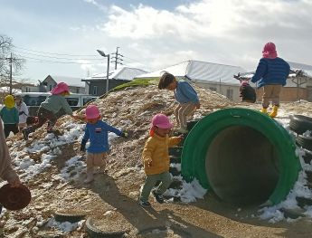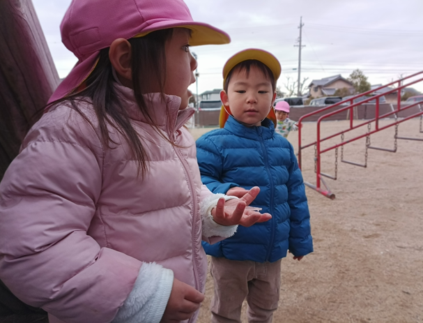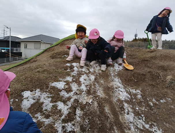 今日は築山に少しだけ雪が残っているのを見つけて、大喜びのももぐみさん。築山の上まで登ろうとしますが、凍っていたこともありツルツル滑るのです。すると、「すべりだいだ!!」と言って滑ってみる子もいて、周りにいた子たちも真似して楽しんでいましたよ♪他にも水たまりが凍っていて、つんつんと触ってみたり「つめたいね!」「きれいだね!」と色んな発見をしました!!