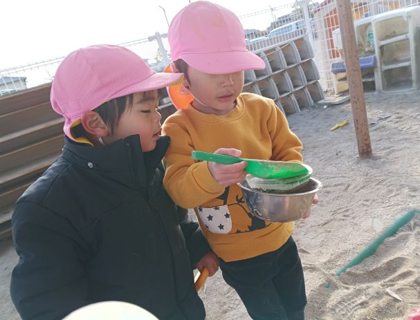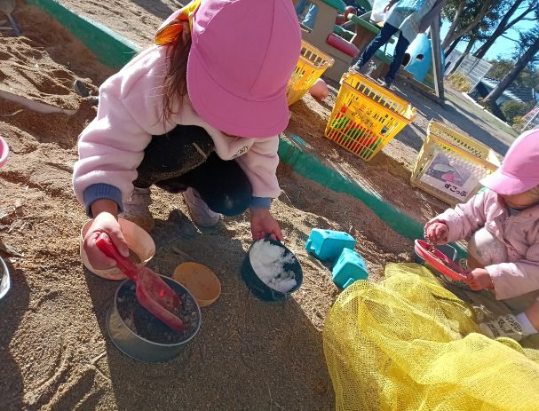 今日も園庭で遊ぶもも組さん。昨日の雪はほとんど解けていましたが、木陰に残っている雪もあり大喜び!!雪をお鍋やコップに入れて集めます。たくさん集まると「おみずいれてみよう」と砂場へ行き、水を入れるのです。すると雪が解けて固まり氷のようになりました!!「こおりができたよ」「かたくなった」と次はその氷をスコップで叩いて割ってみたり、砂と混ぜてみたりします。混ぜると固くなるのが面白かったようで、そこからこおりケーキやアイスを作っていましたよ。こどもたちの興味がどんどんつながって、いろいろな雪遊びを楽しむことができました♪