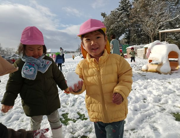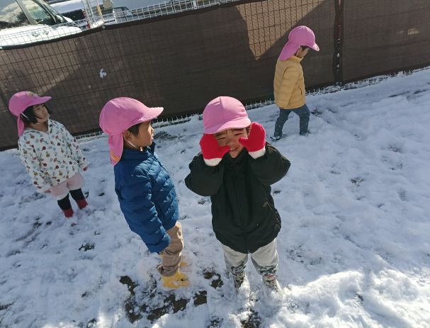 今日は雪が積もりましたね!朝から「ゆきふってるよ!」「くるまがしろかった」と嬉しそうに登園してくるもも組さん。雪が降りやむと「ゆきあそびしよう!」と外に飛び出していきます。早速雪に触り、「つめたーい!!」と大興奮!手でぎゅっと握って丸めたり、靴で踏んでぎゅっぎゅっと鳴る雪の感触を楽しんだりします。また雪玉を作って投げたり、「あててー」と保育士にいって当ててもらったりもしていましたよ。思いきり雪遊びを楽しんで大満足のこどもたちでした♪