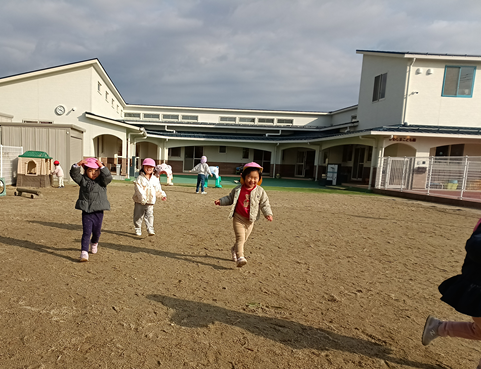 今日は、朝からこどもたちの大好きなオオカミごっこをしました!園庭に行くと、「おおかみごっこしよ!」と保育者を誘い「おおかみがきた!」と逃げ回るのです。三角屋根の所に隠れると、おおかみ(保育者)の様子が気になるのか「くるかな??」と覗いてみるこどもたち。見つかると「キャー!!」と言いながら元気いっぱいに走るももぐみさんでした!