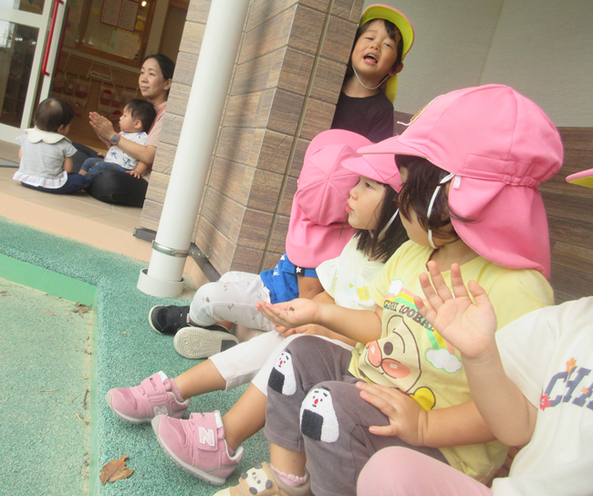 今日は、大きいぐみさんがしていた運動会に向けた体操やダンス・バルーンなどを見てみました!昨日見たこともあり、音楽が聴こえてくると「ここからみる!」とお部屋の前のテラスに座って見ましたよ♪“元気が一番一等賞”の体操を保育者がしているのを見て、一緒にやってみるももぐみさん。真似っこをして元気いっぱいに踊っている姿が可愛らしかったです♪