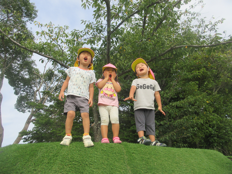 今日も「お外に行く!」と元気いっぱいに出掛けていくももぐみさん。まだまだ気温も高いため、こまめに水分補給・休憩をしっかりしながら外遊びを楽しみましたよ。外へ行くと「お砂場したい」とこどもたちから知らせがあり、保育者と一緒に大きなスコップを使って大きなお山を作るのです!!お水を持ってきてお山にかけてくれる子、お山を固めようとスコップでトントンする子など楽しんでいましたよ♪「みて~!!」「大きいお山!」と嬉しそうなこどもたちの表情にほっこりしましたよ。