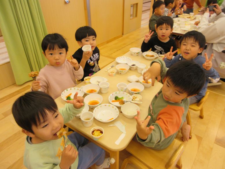 ゆり・ばらぐみさんと一緒にホールでクリスマスパーティーをしました!お歌のプレゼントでは、「この曲しってる!」とすみれさんも一緒に口ずさんでいる姿が見られたり、絵のプレゼントをもらった子たちは友だちと見せ合い喜んだりと、楽しい時間を過ごしたこどもたち♪給食の時間には、お部屋に飾っていたクリスマスツリーを「ホールに飾りたい!」という子の声も上がり、クリスマスツリーを飾って、みんなでテーブルを囲い、待ちに待った給食の時間に!こどもたちの心に残る時間になっていたらと思います。