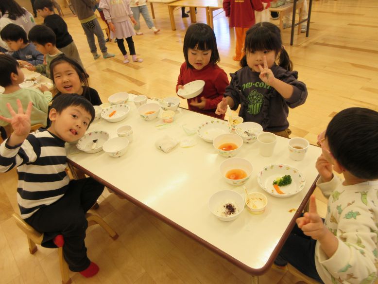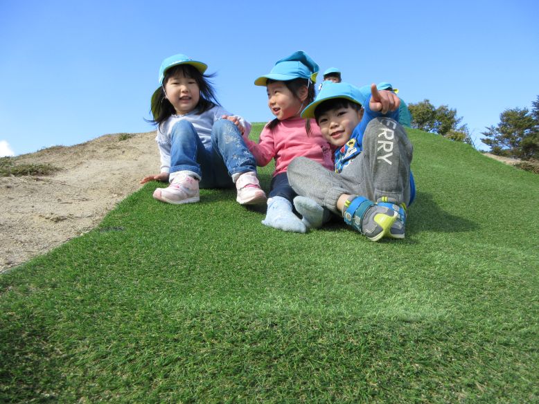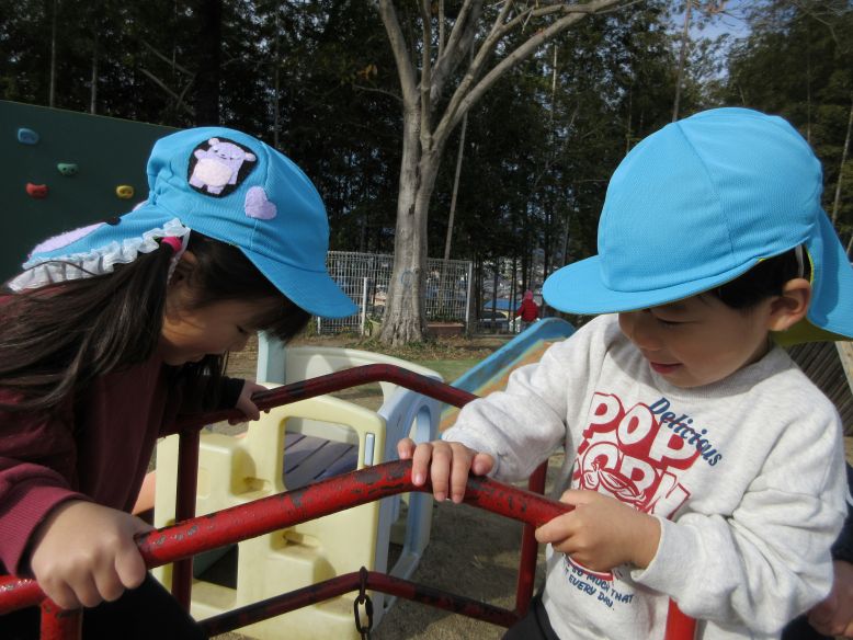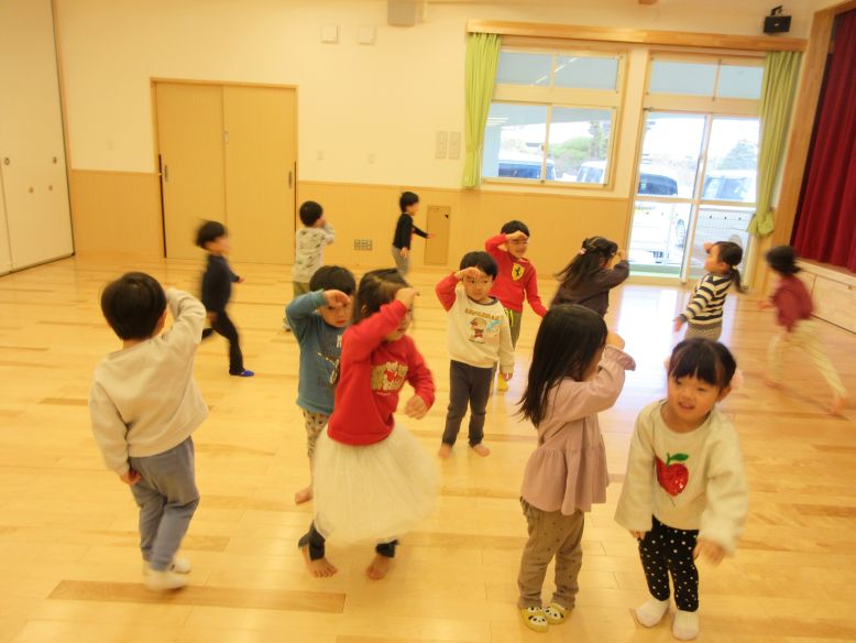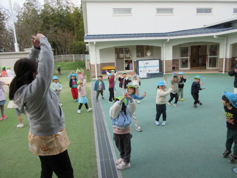 天気が良く、園庭へ行ってみるものの「お外さむい~」のすみれさん。そんな中、園庭から曲が流れ、ゆりさんも一緒に、みんなで体操をしました。曲が聞こえて園庭へ来る子の姿や、体を動かしているうちに少しずつ笑顔になるこどもたちも見られ、体も心もぽかぽかに♪体を動かすことが大好きな子が多いので、かけっこをしたりクライミング遊具に登ったりと思い思いに遊ぶこどもたち。三角屋根の遊具も、気づいた時には自分たちの力で登れるようになった子の姿が良く見られるようになり、日々の成長を感じました。