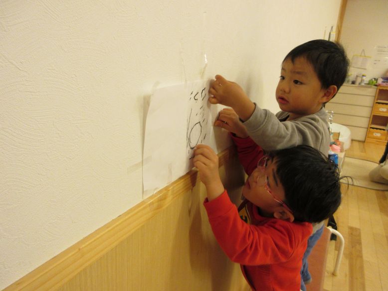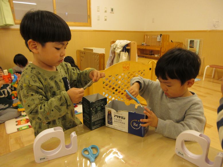 ままごとコーナーが朝から賑やかで、具材を使って遊ぶだけでなく、少しずつ遊びに変化が見られているすみれさん!紙に数字を書いて番号札を作ったり、絵を描いた看板を貼ったりと工夫をしながら遊びが深まっていく姿に日々、感心しています。今日は天候が悪く、保育室での時間が多かったものの、空き箱や色画用紙を使って思い思いに制作を楽しむ姿や、ホールでもダンスをしたりして充実した時間になりました。