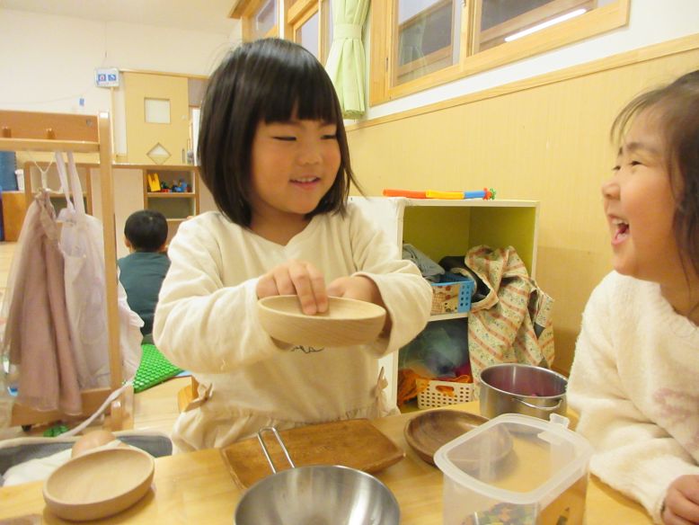 園庭へ行くと、砂場で お山づくりが始まりました♪友だちと力を合わせて砂を集めたり、新たに作り始める子の姿も見られ、夢中になるすみれさん。保育室のままごとコーナーでは、お誕生日のパーティーが♪友達の服に載っていたケーキを見て「どのケーキが食べたい?食べてもいいよ!」とこどもたちで盛り上がる場面も見られ、とても微笑ましかったです。