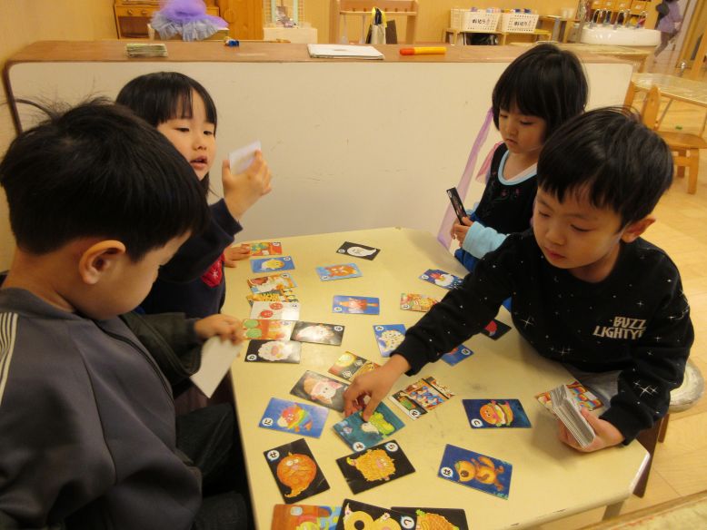 天気がぽかぽかで園庭へ行く子が多く、思い思いに遊ぶこどもたち。ルールのある遊びが広がる姿も見られ、赤いつり橋で鉢合わせた子たちは“じゃんけんで勝ったほうが進める”とこどもたちの中で展開されていましたよ。以前は「○○が先」などと互いの思いがぶつかることもありましたが、新たに楽しみ方を見つけて、こどもたちで遊ぶ姿には微笑ましい気持ちになりました。保育室では、かるたが大盛り上がり!こどもたちで読み手・取り手になって楽しんでいますよ。