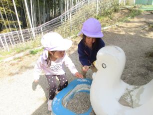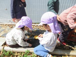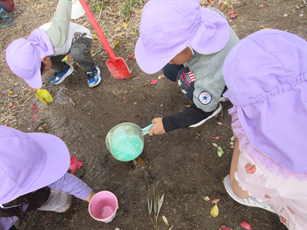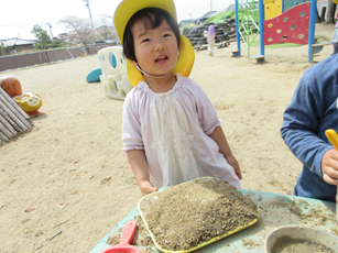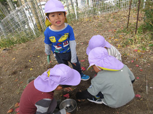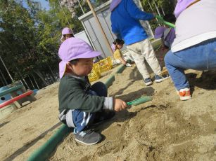 また、砂場ではお山づくりが始まって、大きなお山ができると「トンネルをつくろう」とスコップで掘りはじめました。何度崩れても「もういっかい!」と諦めず掘る子どもたち…。崩れないように力加減を調整したり、水で固めたりと子どもたちなりに工夫してついにトンネルが完成し、トンネル越しに「おーい!見えるかな?」「手がとどくよ」と握手していましたよ。