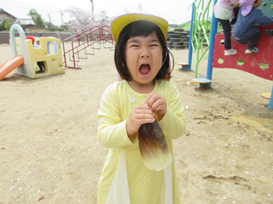 お外に出ると、子どもたちが「たけのこいっぱいあるよー」と元気に教えてくれます。「どれどれ~?」と保育者が見に行くと早速スコップで掘ろうと頑張っていました。「固いな!」と困っていると「あ!大きいスコップ持ってくる」「いいこと考えた!水をかけたらいいんじゃない?」と次々にアイディアを教えてくれて、夢中で掘っていましたよ。周りの子どもたちも「フレフレー」「がんばれー」と応援してくれる姿が微笑ましかったです。そして、ついに…「すっぽーん」とたけのこが抜けて大喜びの子どもたちでした。